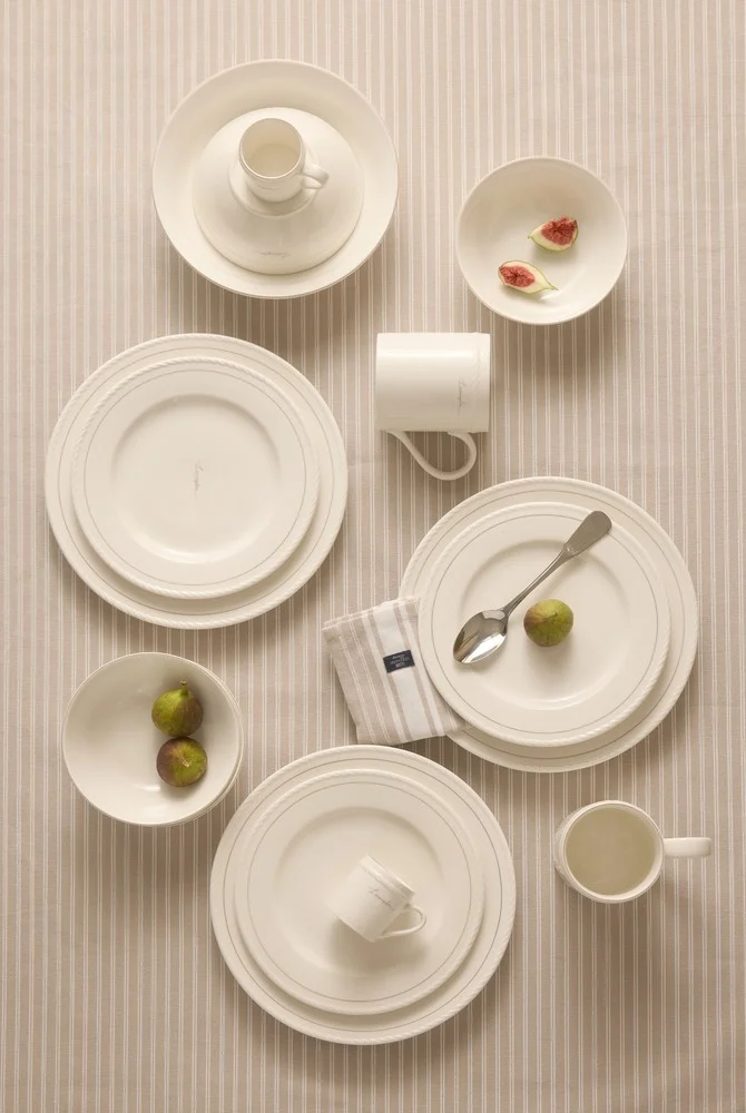 Lexington middags-tallerken er fremstillet af fint porcelæn og kombinerer tidløs elegance med varig holdbarhed. Det har en delikat struktur med rebdetaljer, håndmalede kantstriber og en blank glasurfinish. Denne tallerken er meget modstandsdygtigt over for pletter, varme og ridser. Et raffineret valg til ethvert køkken.