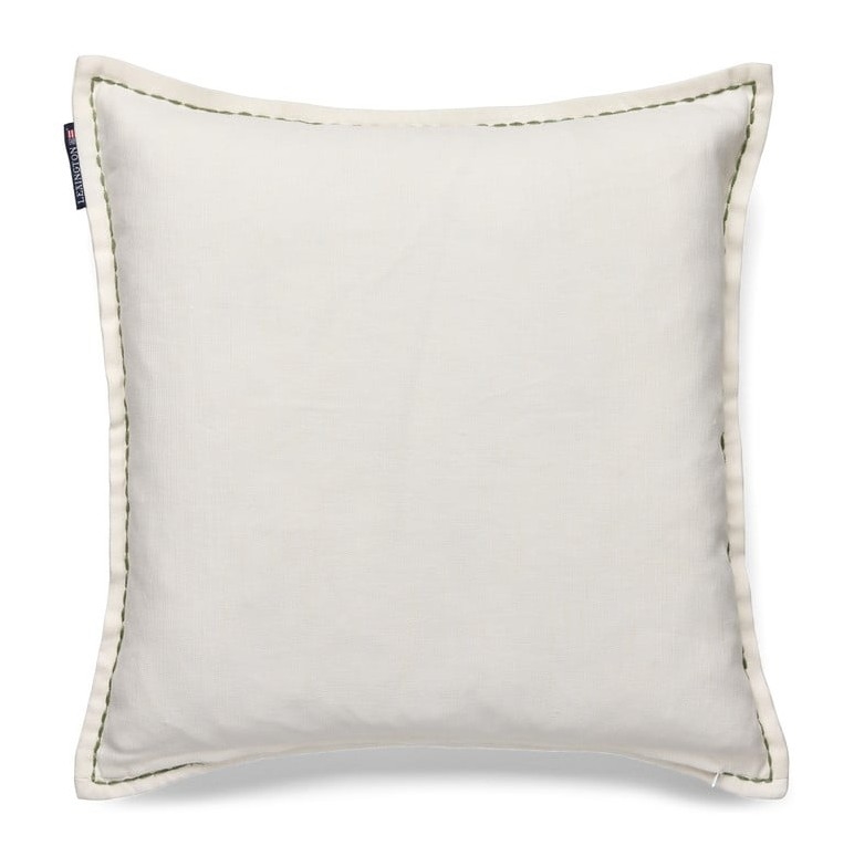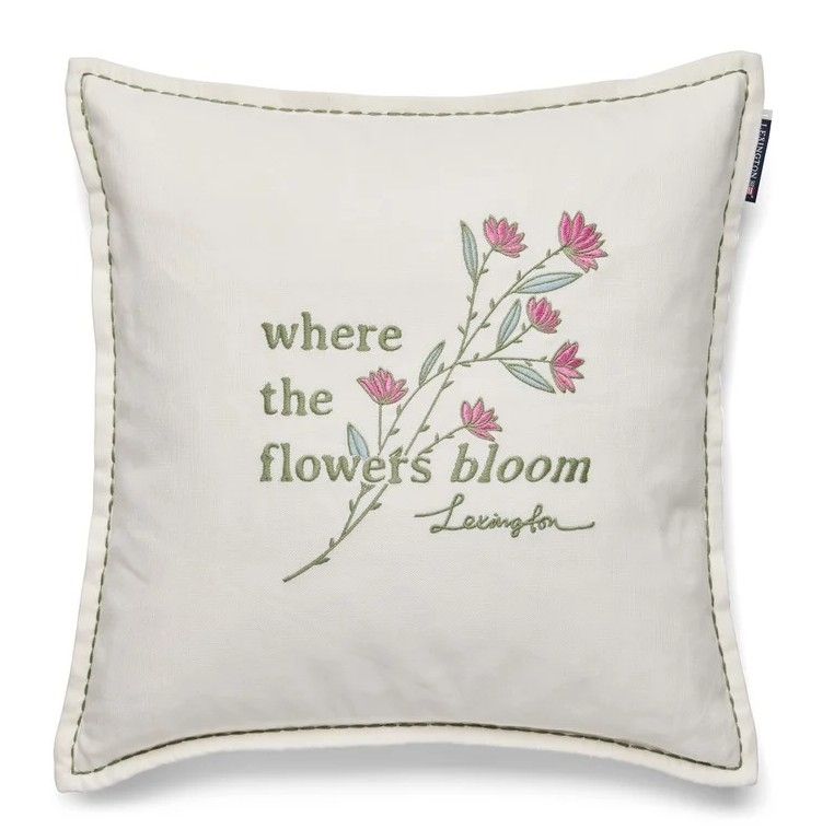 Så fint, indbydende og let pudebetræk i hør/bomuld med Lexingtons unikke broderi foran i levende grønne og lyserøde detaljer og med kraftige stikninger hele vejen rundt. Med skjult lynlås i bunden og Lexington Logo-label på siden.