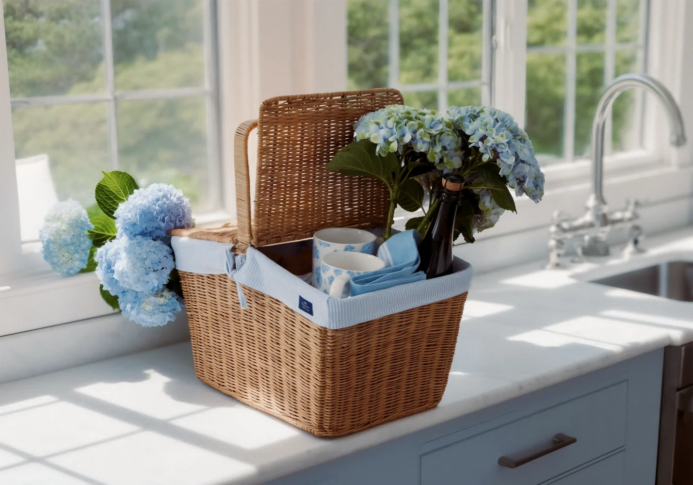 Denne håndlavede picnickurv kombinerer tidløs stil med praktisk funktionalitet. Fremstillet af rattan i høj kvalitet har kurven et åndbart design, der holder din mad frisk under udendørsoplevelser. Det klassiske blå og hvide stribede indlæg tilfører et elegant touch og kan nemt tages ud til vask. Med en robust metalstruktur indvendigt, komfortabelt bærehåndtag og dobbelte låg er denne kurv perfekt til at skabe varige minder på solrige dage.