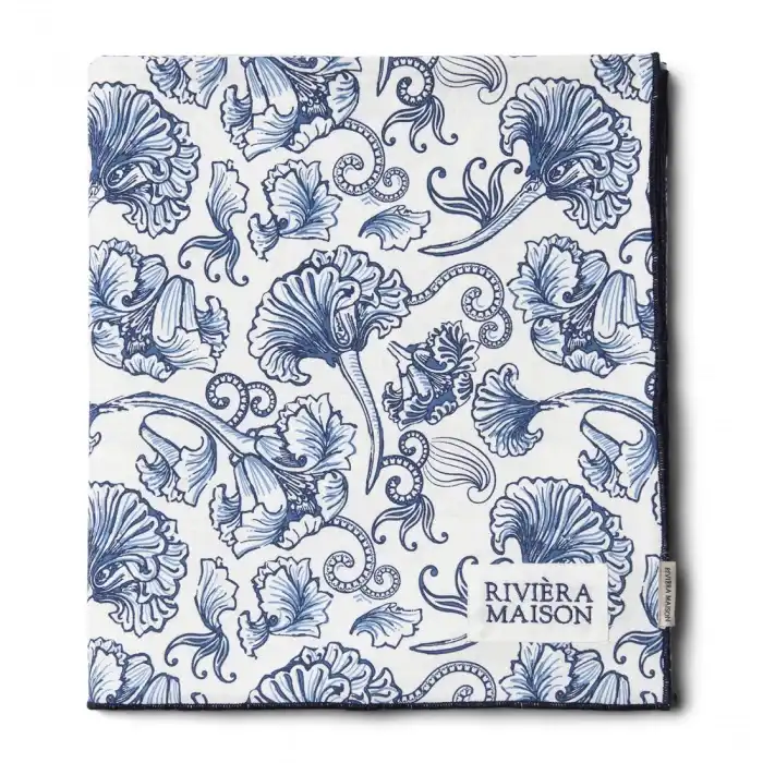 Skøn dug fra Riviera Maison i hvidt/blåt med Logo. Så fin og dekorativ med abstrakt blomstermønster. Der findes matchende servietter til dugen. Mål: 270 x 150 cm Materiale: 100% bomuld Kan vaskes ved 40°C